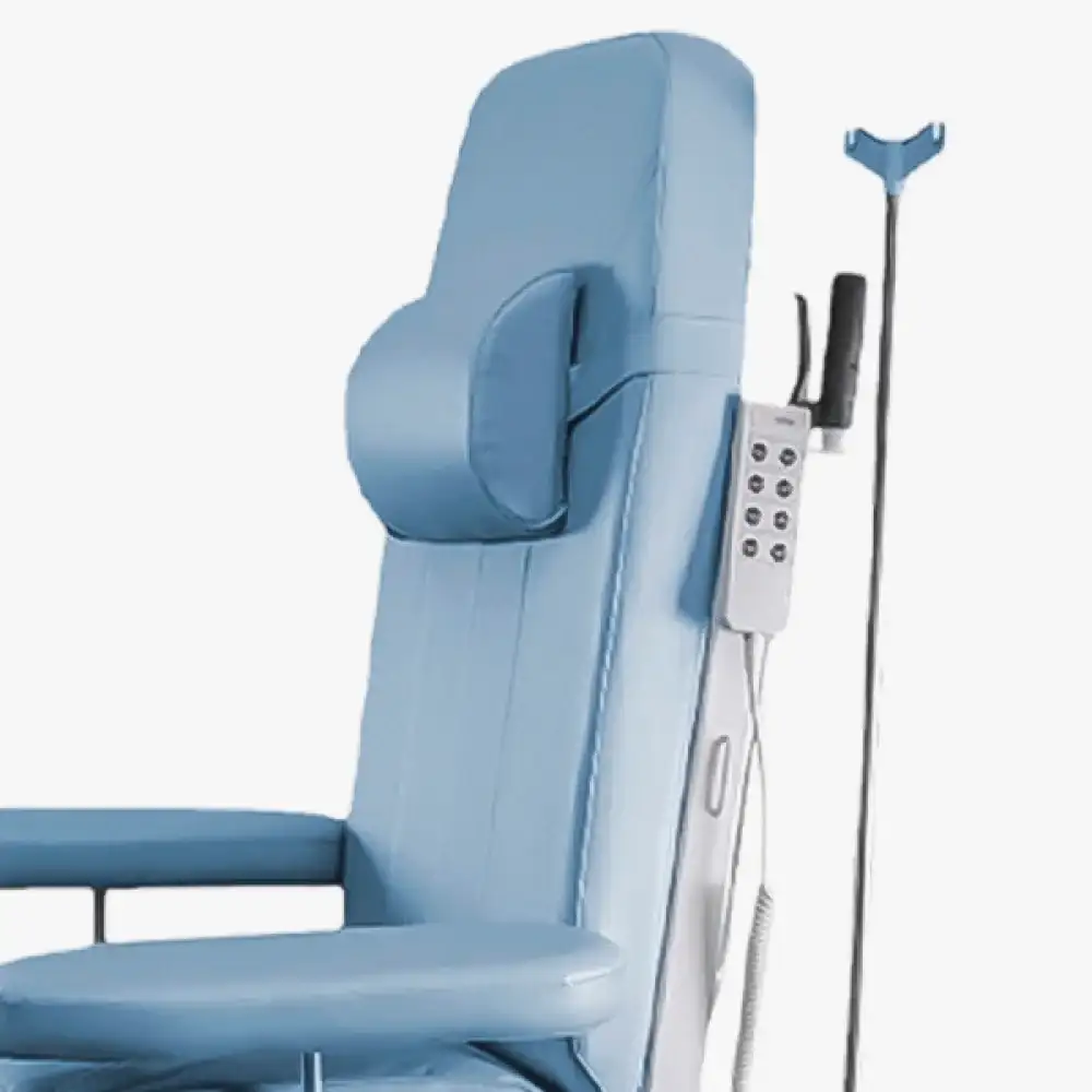 • أماكن مخصصة لحامل المحلول: تم تصميم الكرسي مع مكانين مخصصين لتثبيت حوامل المحاليل، مما يوفر سهولة الوصول للمحاليل الطبية أثناء الإجراءات.