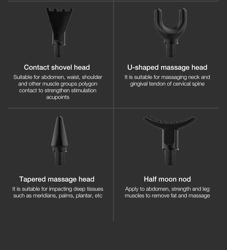 - رؤوس تدليك متعددة: يأتي مع مجموعة متنوعة من رؤوس التدليك لتلبية احتياجاتك المختلفة، سواء كنت بحاجة إلى تدليك عميق للعضلات الكبيرة أو تدليك لطيف للمناطق الحساسة.